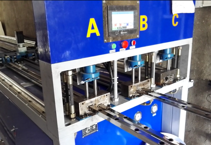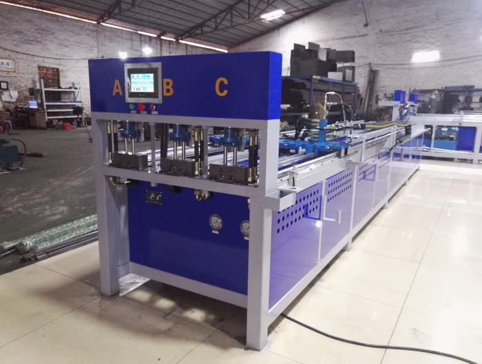 三工位數(shù)控全自動(dòng)沖孔機(jī),三工位同時(shí)工作,一次沖6支管,每個(gè)油缸可單獨(dú)控制沖全孔、半孔,大大提高不銹鋼防盜網(wǎng)沖孔效率,行業(yè)首創(chuàng),專利產(chǎn)品